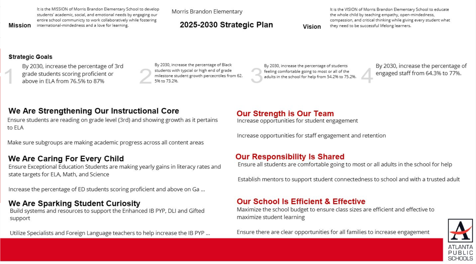 GO Teams consist of 3 parents (elected by parents), 3 instructional staff (elected by staff members), 2 community members (nominated by principal), 1 swing seat (selected by GO Team), and 1 principal (non-voting member). At the high school level, there is also 1 student who serves. But this does not apply to the Morris Brandon GO Team. For more information on GO Teams and the Charter Operating Model, please visit this APS site.